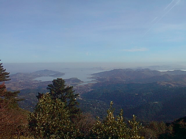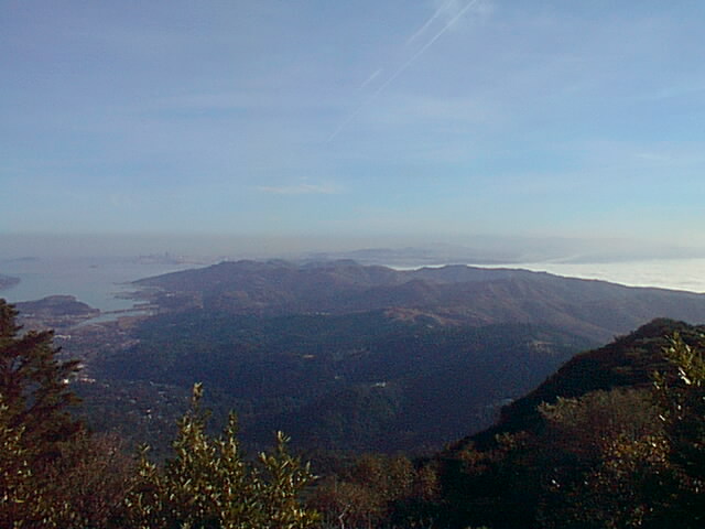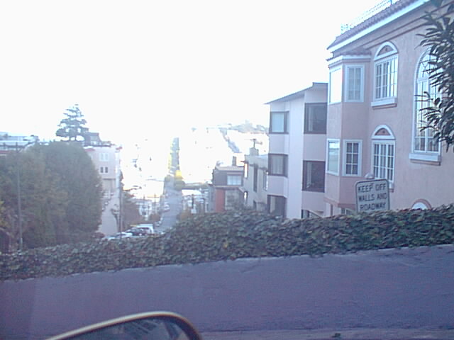We drove up route 1 into the mountains and eventually wound up on Mount Tamalpais, the highest mountain in the Bay Area (I think). From up there, the view down into the bay looked like someone had dropped a cloud into it. We admired the view for a while, then climbed back in the car and zoomed back down to check on my phone. On the way, we went down the twisty part of Lombard Street, which was rather cool. There's something like a 5MPH speed limit on it, and signs telling pedestrians to keep off the walls and roadway.