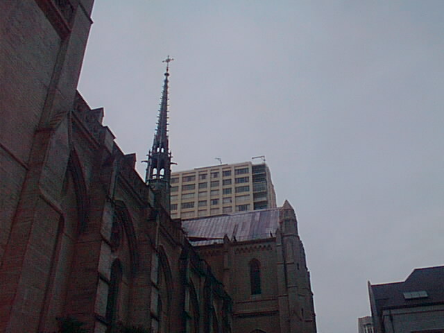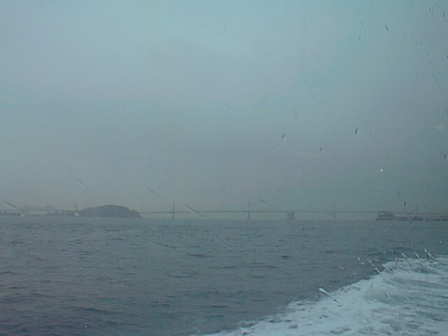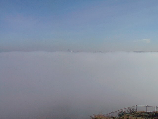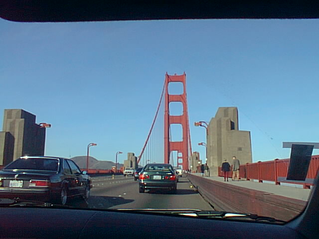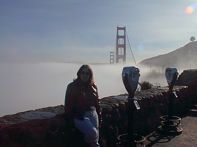 To kill the time, Meredith drives down Geary Boulevard to show me the Irish bars (and the Irish travel agents!), scoots by Grace Cathedral and the newer church that looks like a washing machine agitator, and out through Presidio and the Douglas McArthur Tunnel onto the Golden Gate Bridge. We stop on the far side at the "Vista Point", where we marvel at the fog over the bridge and the obscured city across the bay.