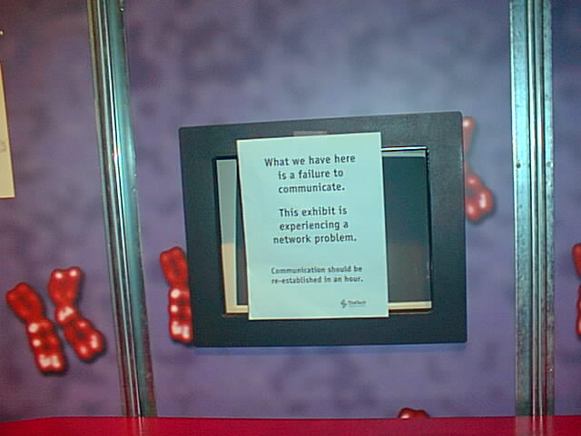 The Tech Museum itself turned out to be a bit of a disappointment. For a start, it seemed less hands-on than the Exploratorium; add to that the fact that a lot of the displays were run-down and some were even broken. I later discovered that it's funded by various companies who display toys and technology there, whereas the Exploratorium is run on grants and the like, which might explain the difference between the two - you get a lot of basic science in the Exploratorium, where as the Tech is filled with commercial applications of technology. As part of the interactivity stuff in the Tech, I got a wrap-around photo taken of my head, which I then rendered in tie-die shades and printed out. Made me look like my head was somewhat cone-shaped, it did. We had a bite to eat in the restau attached to the museum, and even that wasn't great. They did have a neato "your order is ready" gadget, though; when you ordered, you were given a chunky thing made of translucent plastic, which buzzed and lit up LEDs when (presumably) the waitron needed to locate you to give you your pizza or whatever. Not really a substitute for good food, though.