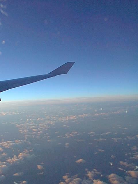 The flights were pretty uneventful; a little turbulence on both, and some nauseous excuse for food. British Midland's idea of breakfast: "a sausage & sweetcorn relish sandwich". The sausage turned out to be a SLICE of sausage. And United gave me what has to be the world's smallest cheeseburger.