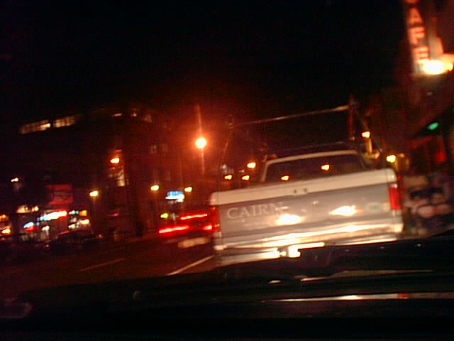 At this point I had to get my stuff from Meredith's place, so we drove out thataway. While pulled in at a kerb somewhere down on Hayward, I saw a pickup truck in front of us with two Irish bumper stickers. Alas, the camera's autofocus had different ideas about what I was looking at, so you can't see them in the picture.