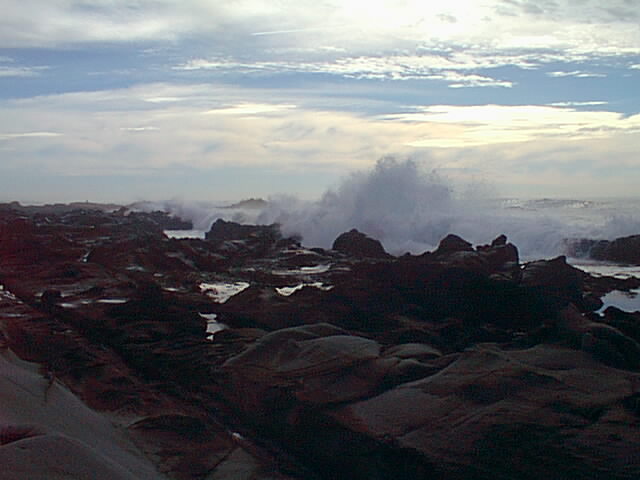 Eventually the detour led us back to the coast road proper, and we motored happily up it. On the way we passed a film crew who were attended by more police cars than I'd seen collected in a single spot in the city. As we went further north, the reception dropped out completely on my cellphone (although not Donal's, since his does analogue as well as digital roaming) and the radio stations progressively dropped off until we were left with some random Christian rock station. ARGH. And the stereo in the car had a cassette deck but no CD player (in fact, pressing the button marked CD caused the LCD to display "NO" for a few seconds). The music wasn't bad, but the DJs were awful, so every so often I'd poke at the radio in the hope of finding a better station, and we eventually resorted to mocking the guy on the radio for amusement.