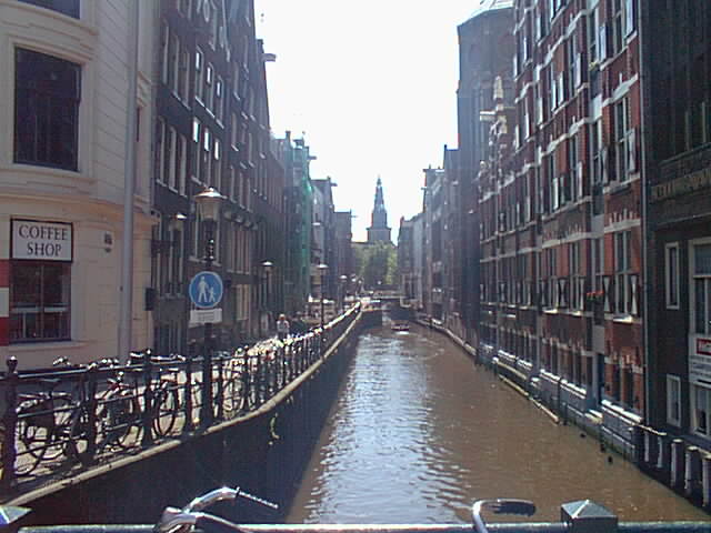 Amsterdam summed up: A canal, bicycles, an old building, and a coffee shop. Oh, and this is not far from the red light district.