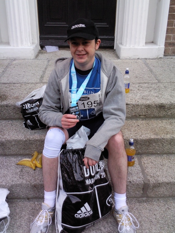 I was almost in tears when I got my finisher's medal. I thanked the girl who gave it to me profusely, then queued to have my photo taken, picked up my goodie bag, and retrieved my stuff. As I exited the "participants only" area, I pretty much ran straight into Cliffy who'd been waiting for me since I'd texted him just after crossing the line. Bren was sitting in a doorway over to the left, having probably passed me while I was walking the 24th mile; he'd reeled in a 3:46 personal time - I figure if I'd actually run with him, he wouldn't have gotten that, but at the same time I might've made a better time; it's not really important now, though. We sat there laughing and joking and hurting while Rach and Cliffy took some photos, and then headed for home. On the way, I stopped to thank a completely random Garda for supporting the marathon; he looked surprised, but accepted my thanks graciously.